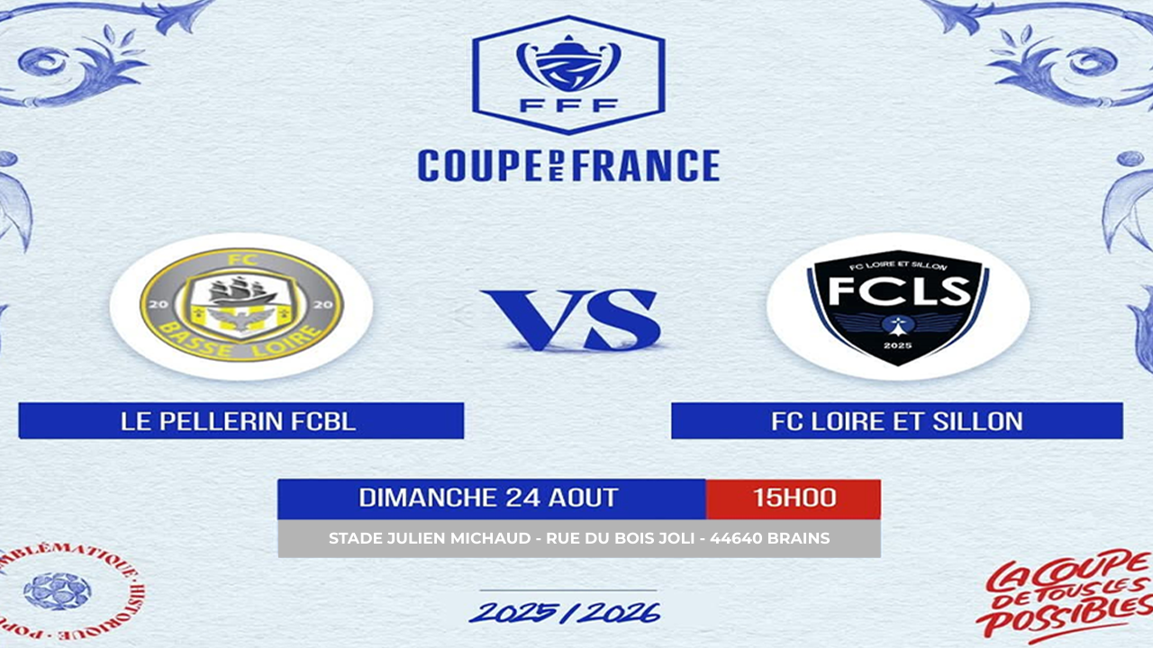 Coupe de France – 1er Tour Objectif qualification ! Dimanche 24 août à 15h00, le FC Loire et Sillon entre en lice pour la Coupe de France 2025/2026 ! Nous affronterons Le Pellerin FCBL sur leur terrain : Stade Julien Michaud Rue du Bois Joli, 44640 ...